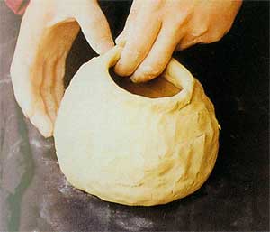 泥條盤筑 泥條法是通過泥條來構筑成型的一種盤筑技法。泥條可以是經手搓成,也可以通過壓泥條工具擠壓成型。搓泥條時要把握好你的可塑性,以免在盤筑形狀時產生開裂。如果你想以泥條盤筑法一次完成一件大作品或一件很復雜的作品,是較困難的。因為作品要有一定強度才能使你繼續盤高,而且連接部位要保持一定的濕度,才能保持胚體之間的粘接。在盤筑過程中,要把握好泥的干濕度,注意掌握好造型的輪廓線。以泥條盤筑法創作的作品特點是古樸、流暢,富于變化。